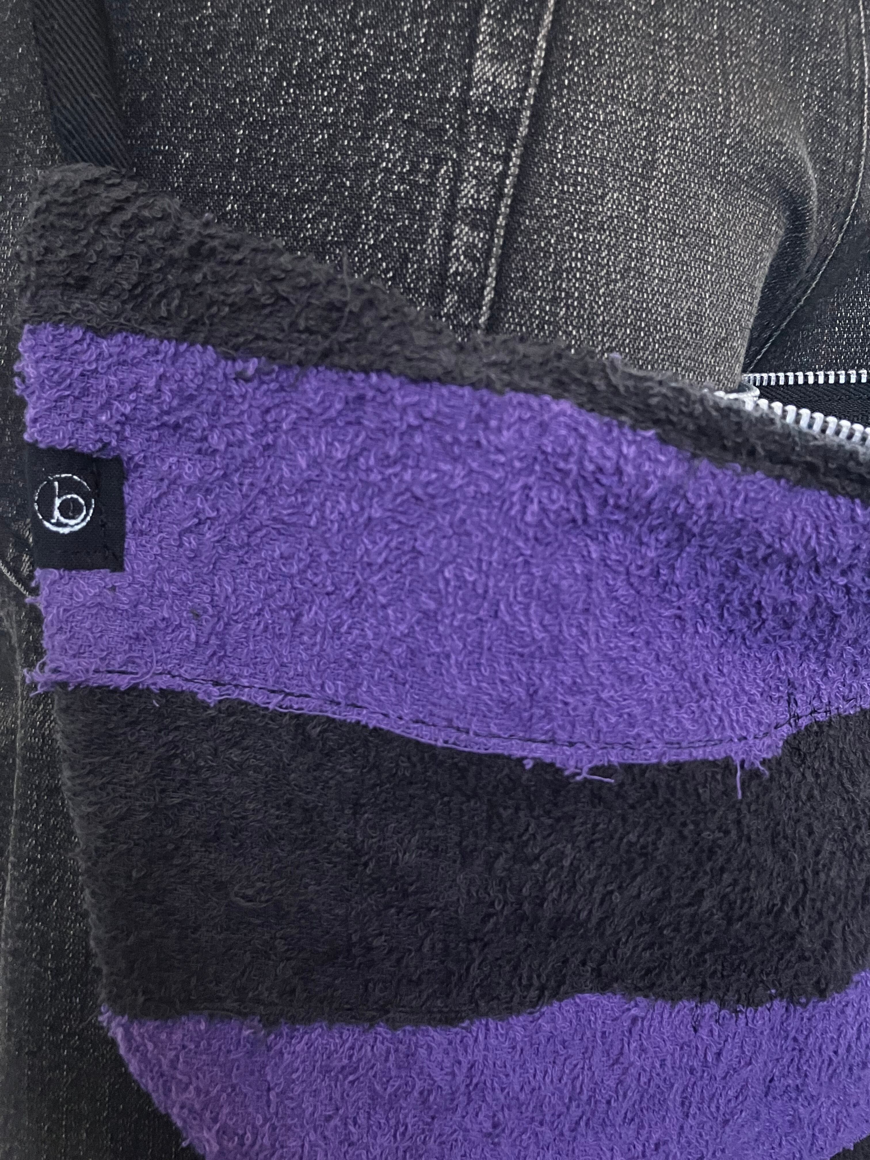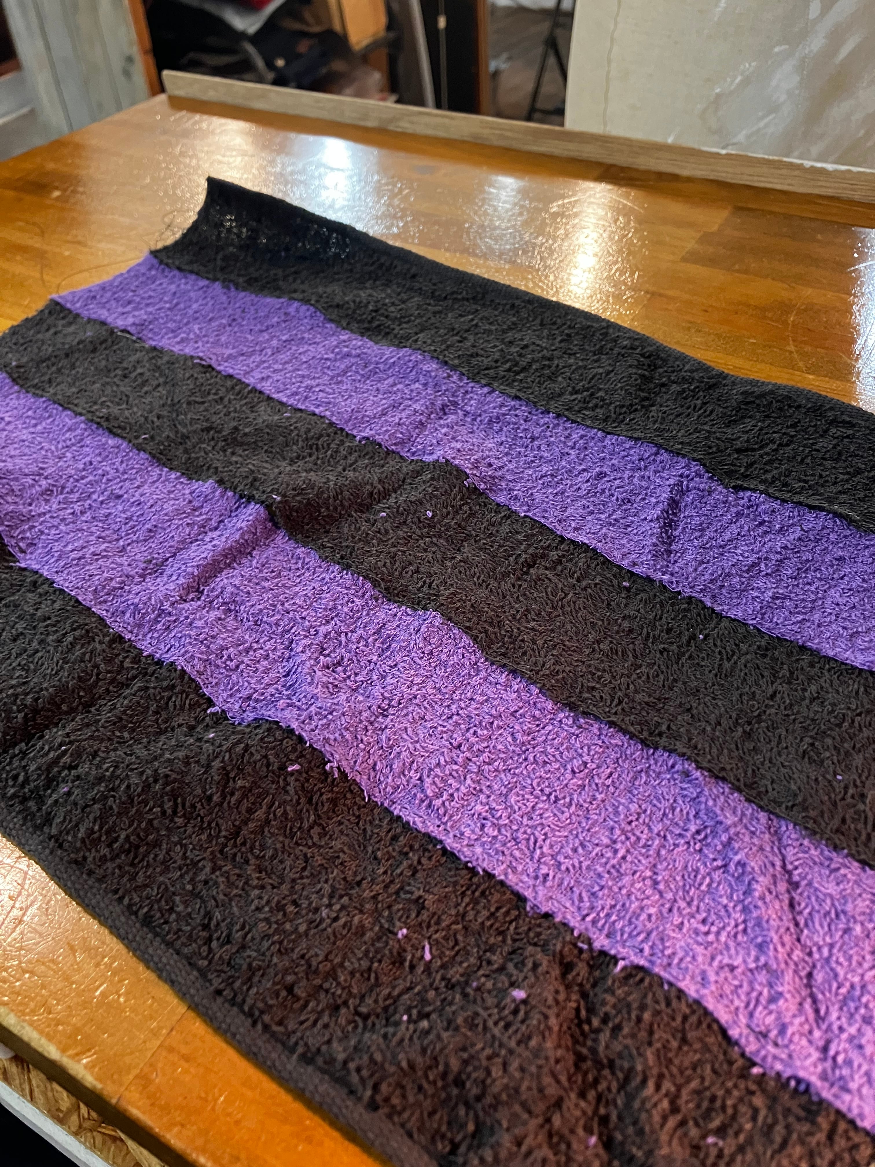 黒と紫のタオルをボーダーにツギハギして